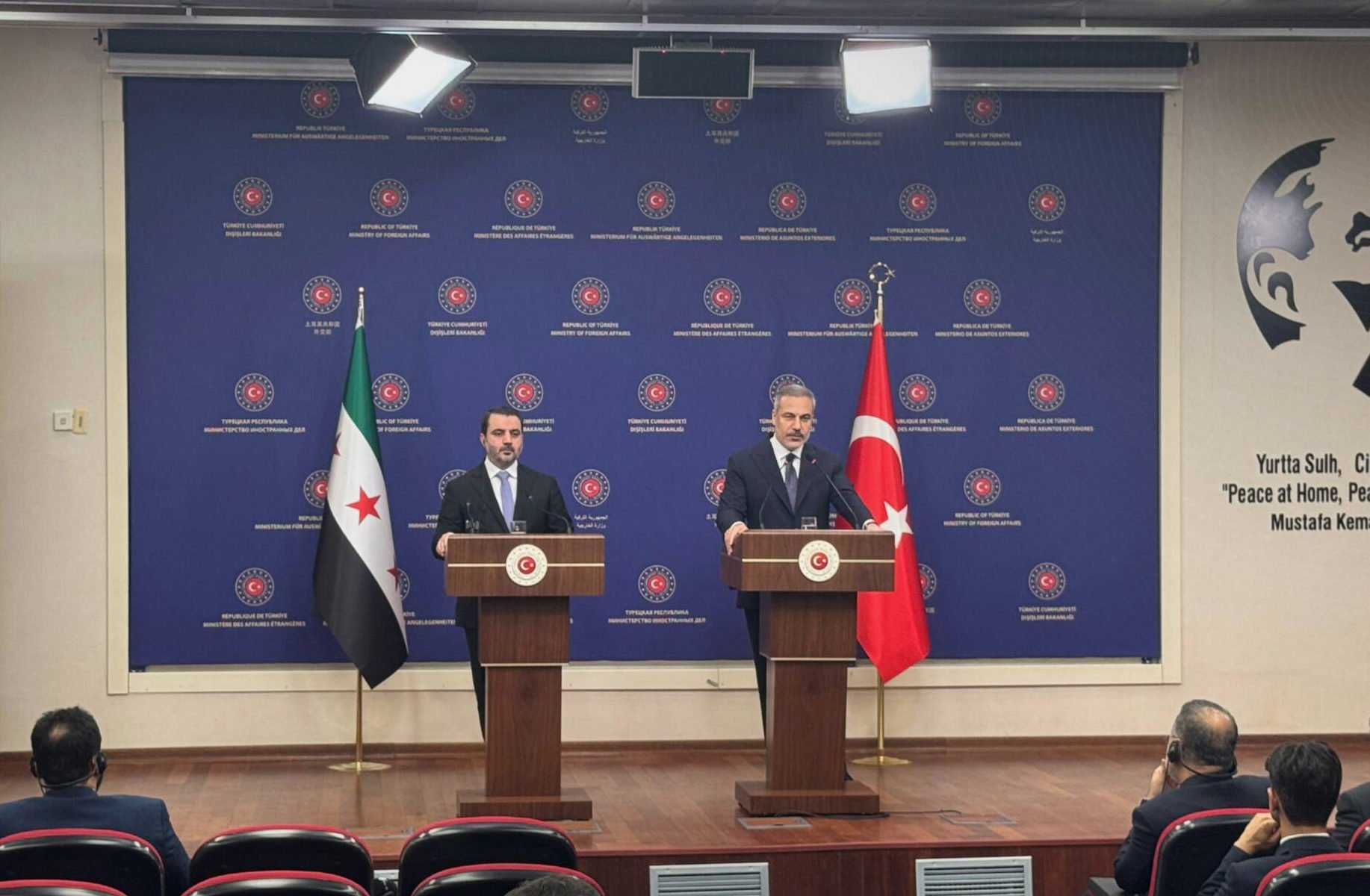 وأضاف: إن موقفنا هذا يأتي انطلاقاً من سيادة دولتنا ومؤسساتنا وتثبيتاً لشرعيتها، بأن سلامة سوريا ووحدة أراضيها مرتكز أساسي لبناء دولتنا الجديدة، وصمام أمان لاستقرار المنطقة بأسرها، وهو ما أكدت عليه اليوم في اجتماعاتنا مع الوزير فيدان.