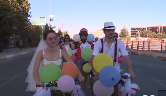 احتفل عروسان تركيان في مدينة دياربكر بجنوب شرق تركيا بحفلة عرسهما بركوب دراجات هوائية وجابا شوارع المدينة، ومن خلفهما الأصدقاء والأقارب، بهدف لفت الأنظار إلى الأزمة المرورية، وتشجيع الآخرين على ركوب الدراجات.