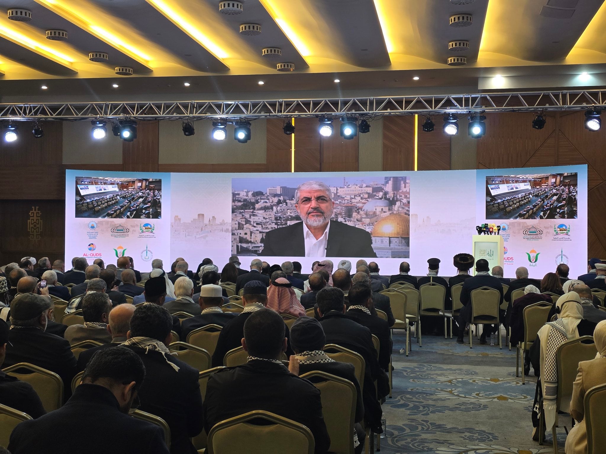 وعبر اتصال مرئي، اعتبر القيادي في حركة المقاومة الإسلامية (حماس) خالد مشعل أن شعار المؤتمر يعبر بدقة عن اللحظة التاريخية الراهنة، محذرا من مشروع شامل لإعادة هندسة غزة جغرافيا وديمغرافيا وأمنيا، وضرب سلاح المقاومة وفرض الوصاية على القرار الفلسطيني واستكمال تهويد القدس وضم الضفة واستهداف الأسرى والمنطقة برمتها تحت عنوان "إسرائيل الكبرى".