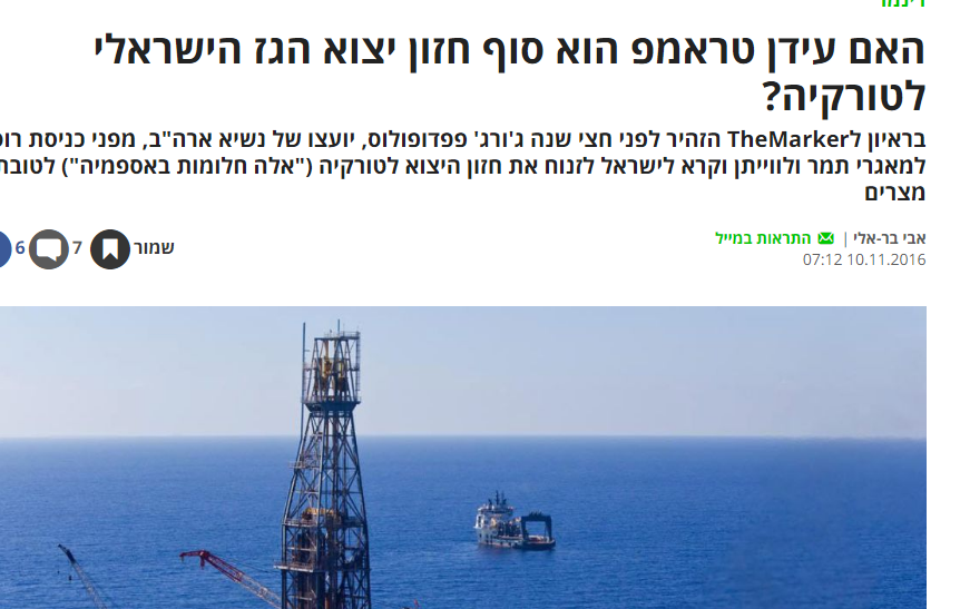 دعا جورجي بابودوبلوس مستشار الرئيس الأمريكي المنتخب دونالد ترامب للشؤون الخارجية، الحكومة الإسرائيلية إلى التخلي عما أسماه أحلام اليقظة بتصدير الغاز الطبيعي الإسرائيلي إلى تركيا، والتوجه بدلا من ذلك لتصديره إلى مصر.