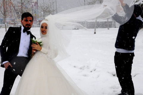 احتفل عروسان تركيان بزفافهما على بساط من الثلوج في حديقة عامة بمدينة يالوفا التركية.
