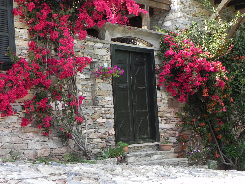 رَكنّا سيارتنا عند مدخل القرية حيث ينتهي عنده الطريق الإسمنتي، وبدأنا بمشاهدة أزقة القرية المرصوفة بالحجارة، تابعنا المسير لنرى منازل القرية الأثرية المبنية على الطرازين العثماني والرومي والمنتشرة بين الأشجار والنباتات الخضراء والأزهار الملونة.