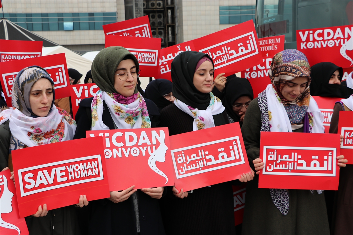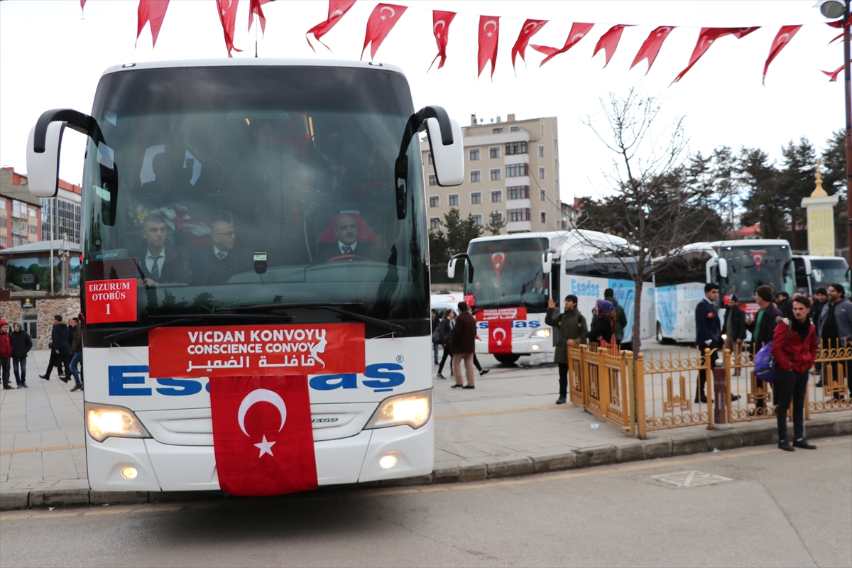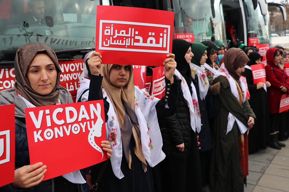 انضمت 200 سيدة متطوعة بأربع حافلات من ولاية أرضروم، إلى "قافلة الضمير" وتوجهن إلى الحدود السورية بولاية هطاي، وذلك للتضامن مع النساء المعتقلات بشكل غير قانوني، في سجون النظام السوري.