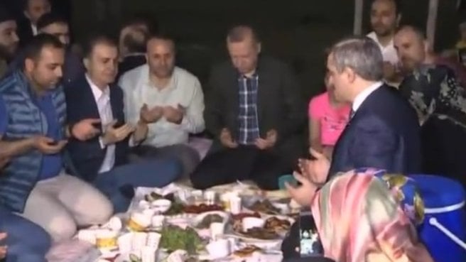 ولبّى الرئيس التركي دعوة إحدى العائلات التي افترشت الأرض ووضعت سفرة الإفطار فوق العشب، وأفطر معهم.