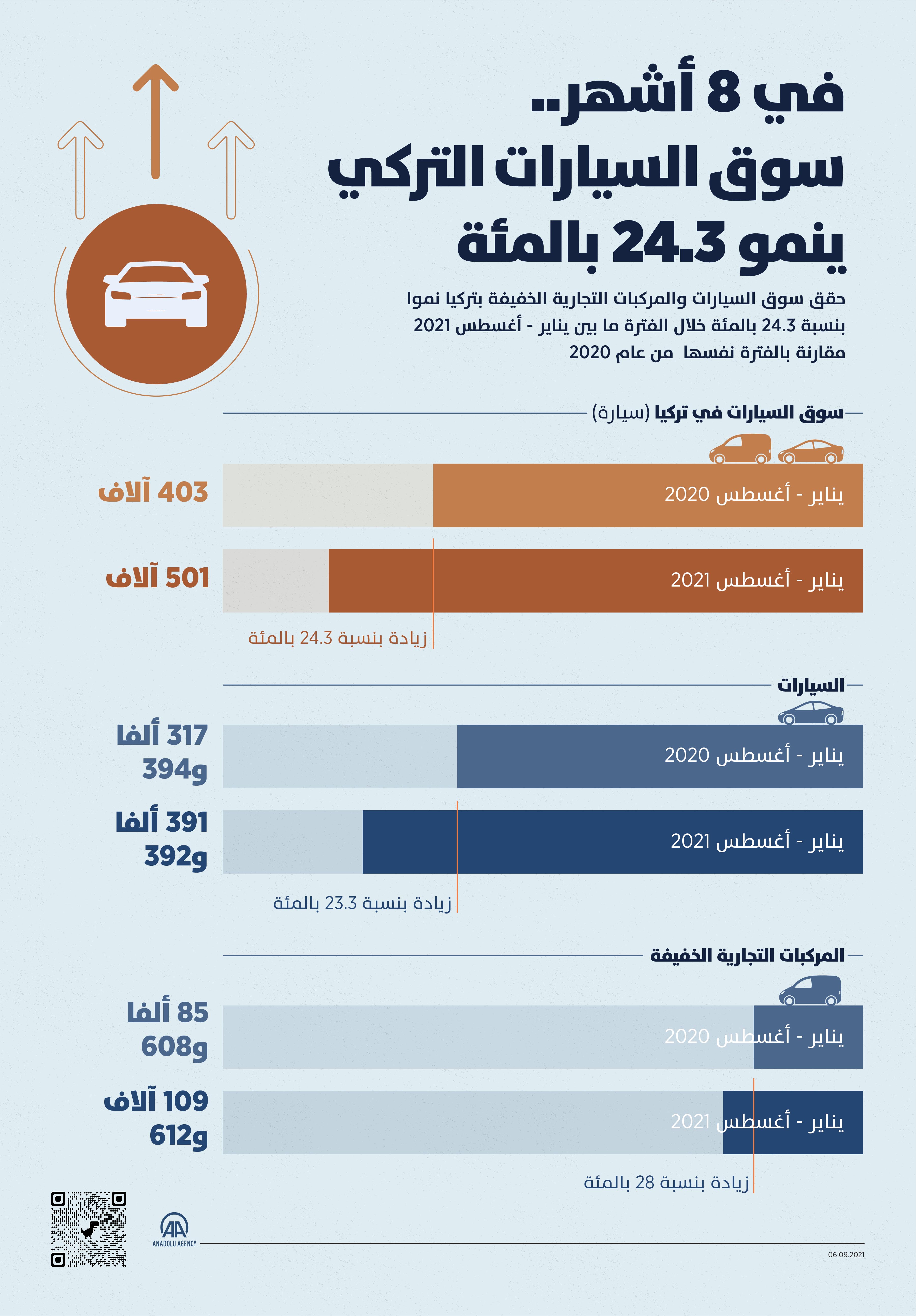 حقق سوق السيارات والمركبات التجارية الخفيفة بتركيا نموا بنسبة 24.3 بالمئة خلال الفترة ما بين يناير - أغسطس 2021 مقارنة بالفترة نفسها من العام الماضي. وفق وكالة الأناضول.