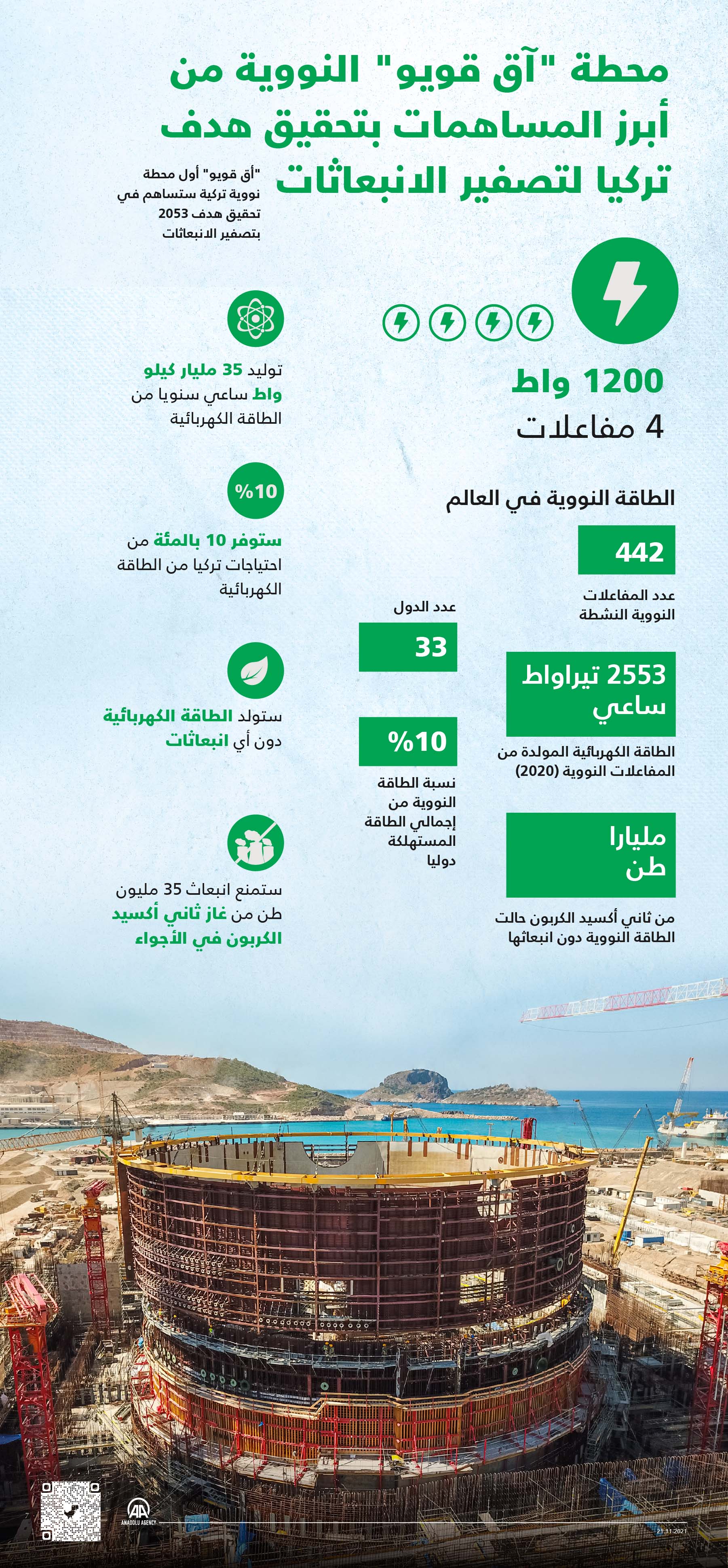 "أق قويو" أول محطة نووية تركية ستساهم في تحقيق هدف 2053 بتصفير الانبعاثات. وفق وكالة الأناضول.