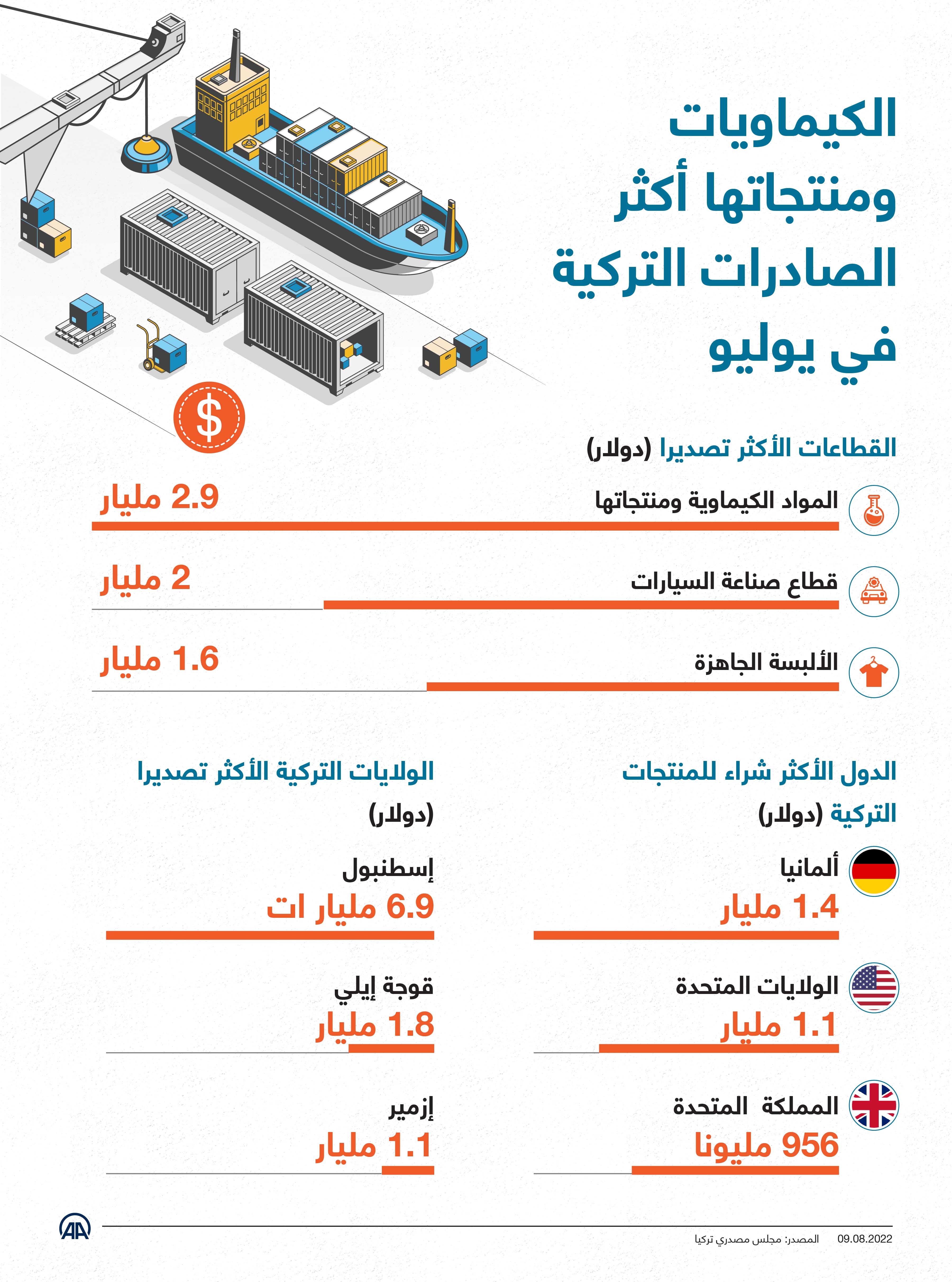 الكيماويات ومنتجاتها أكثر الصادرات التركية في يوليو، وفق وكالة الأناضول.