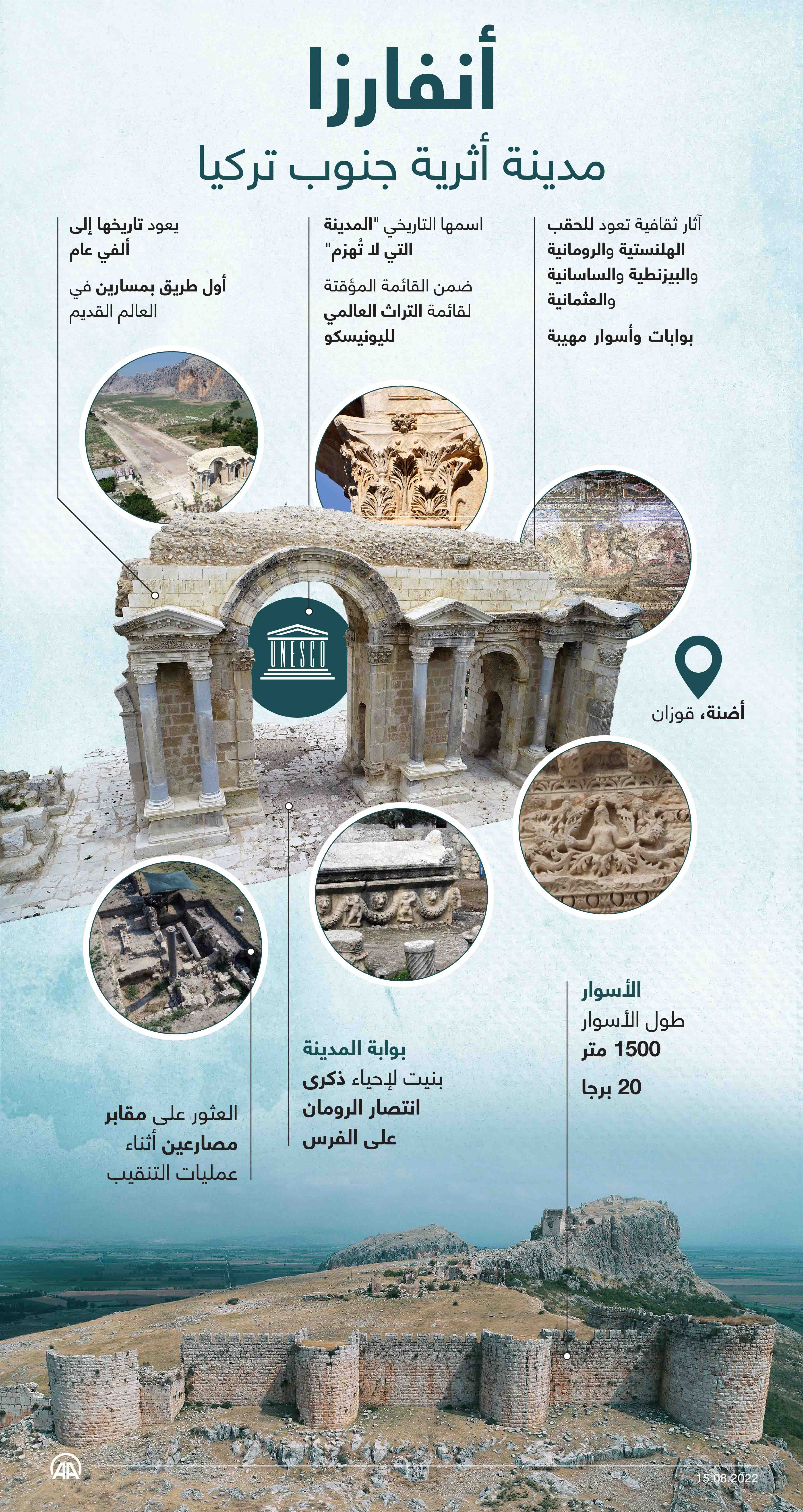 أعمال التنقيب الموسمية في مدينة "أنافارزا" التاريخية المدرجة على قائمة اليونسكو للتراث العالمي المؤقت. عرفت في التاريخ باسم "المدينة التي لا تقهر". تلقي الضوء على تاريخ المدينة وبوابتها وأسوارها الشامخة بالإضافة إلى طريقها الذي يعد أول طريق مزدوج في العالم القديم. وفق وكالة الأناضول.