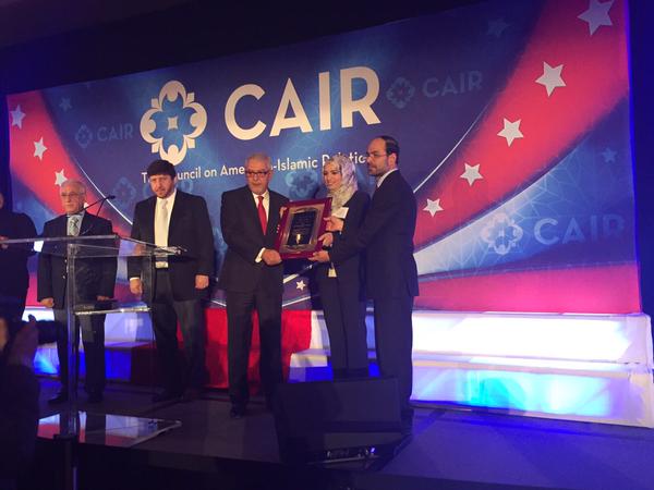 وأقام المجلس، المعروف بدفاعه عن حقوق وقضايا المسلمين في أمريكا، حفل توزيع جوائز "رواد المدافعين عن العدل"، اليوم الأحد، وشارك فيه عدد كبير من المدعوين من بينهم الناشطة اليمينة الحائزة على جائزة نوبل للسلام، توكل كرمان، والطالب المسلم، أحمد محمد، مخترع الساعة، التي ظنها الأمن الأمريكي في مدينة تكساس قنبلة.