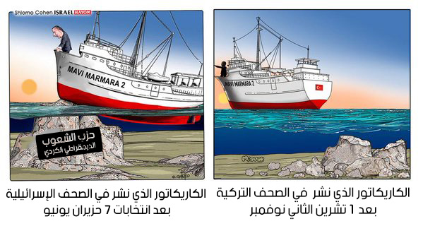 وأبرز ما نشر حينها في الصحف الإسرائيلية ما جاء في موقع متخصص للرسومات الكريكاتورية، صورة تظهر الرئيس التركي "أردوغان" وهو على متن سفينة "مافي مرمرة" "أسطول الحرية" التي تتجه نحو غزة فتصطدم بجبل ثلجي مكتوب علية حزب "الشعوب الديمقراطي الكردي"، لتبدأ السفينة بالغرق شيئا فشيئا من دون أن تكمل طريقها نحو غزة.