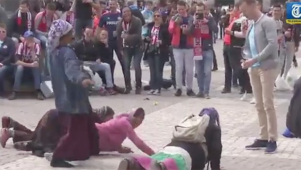 فقد ظهر في التسجيل المصور مشجعو فريق "أيندهوفون" الهولندي وهم جالسون في ساحة مدريد في إسبانيا، قبيل بدء المباراة، ويرمون بالقطع النقدية على الأرض، فيلتقطها نسوة، لاجئات، الأمر الذي أدى إلى انتقادات كبيرة لدى الصحف العالمية، وكذلك الحكومات، بالإضافة إلى غضب عارم في الشارع التركي.