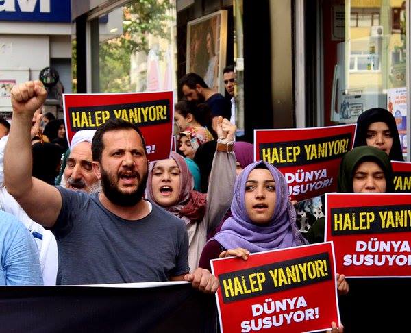 نظم سكان ولاية دياربكر في جنوب شرق تركيا وقفة احتجاجية تنديدا بالمجاز التي ترتكبها روسيا وقوات النظام السوري بحق المدنيين في ولاية حلب السورية.