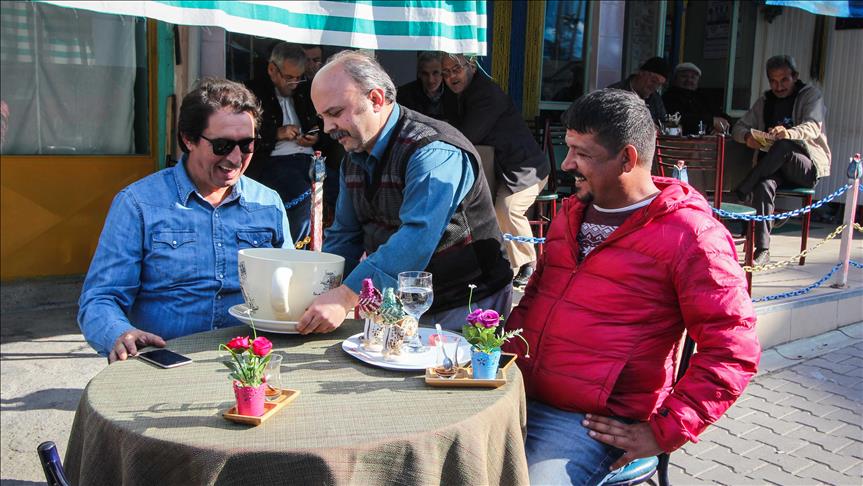 بطريقة فريدة من نوعها، يستقبل "فريدون تركمان" زبائنه الجدد في مقهاه بولاية بورصا شمال غربي تركيا؛ الأمر الذي لم يسلم منه حتى بعض المسؤولين المحليين والسياسيين.