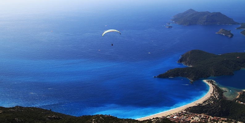 وتحت أقدام المغامر ترتسم صورة من أجمل المناظر الطبيعية في العالم لتمازج جبال موغلا الخضراء وساحل البحر الميت وزرقة مياه البحر الساحرة.
