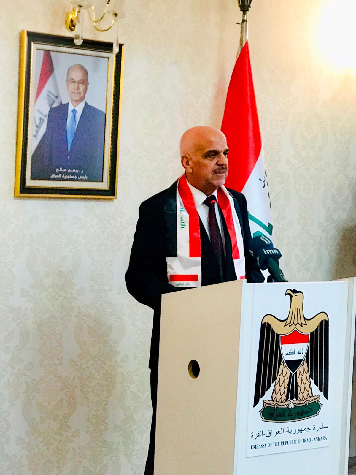 أعقبت تلك المراسيم كلمة السفارة العراقية ألقاها السفير العراقي، والتي هنأ فيها الشعب العراقي بهذه المناسبة العظيمة مناسبة التحرر من دنس داعش الإرهابي في كافة انحاء العراق، حيث أكد سعادته على أن العراقيين وقفوا وقفة رجل واحد لمؤازرة القوات المسلحة وكافة الفصائل التي كان لها دور طليعي في عملية التحرير من الحشد الشعبي والبيشمركة، وقد استحضر السفير البطولات التي سطرها الكثير بملاحم خالدة من العسكريين وأفراد الأمن والحشد.