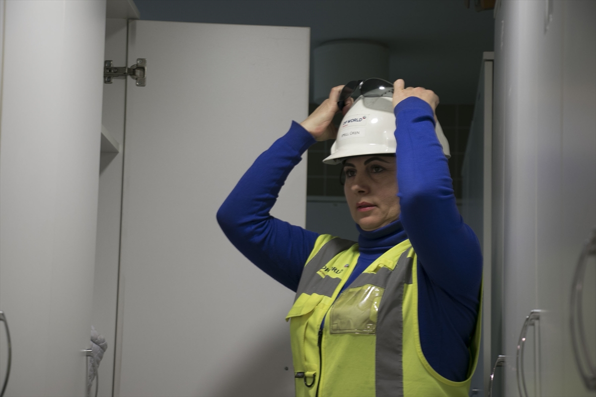 تعمل أوران، سائقة لآلة تكديس ونقل الحاويات في ميناء "ياريمجا" الدولي (DP WORLD YARIMCA LIMANI)، بولاية "كوجا إيلي" غربي تركيا، منذ 3 سنوات.