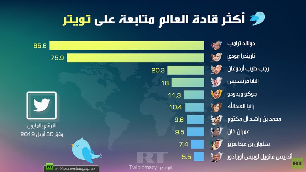 وحلّ حساب الرئيس التركي أردوغان (@RTErdogan) في المركز الثالث ضمن أكثر زعماء العالم متابعة، بعدد متابعين تجاوز 20 مليون.