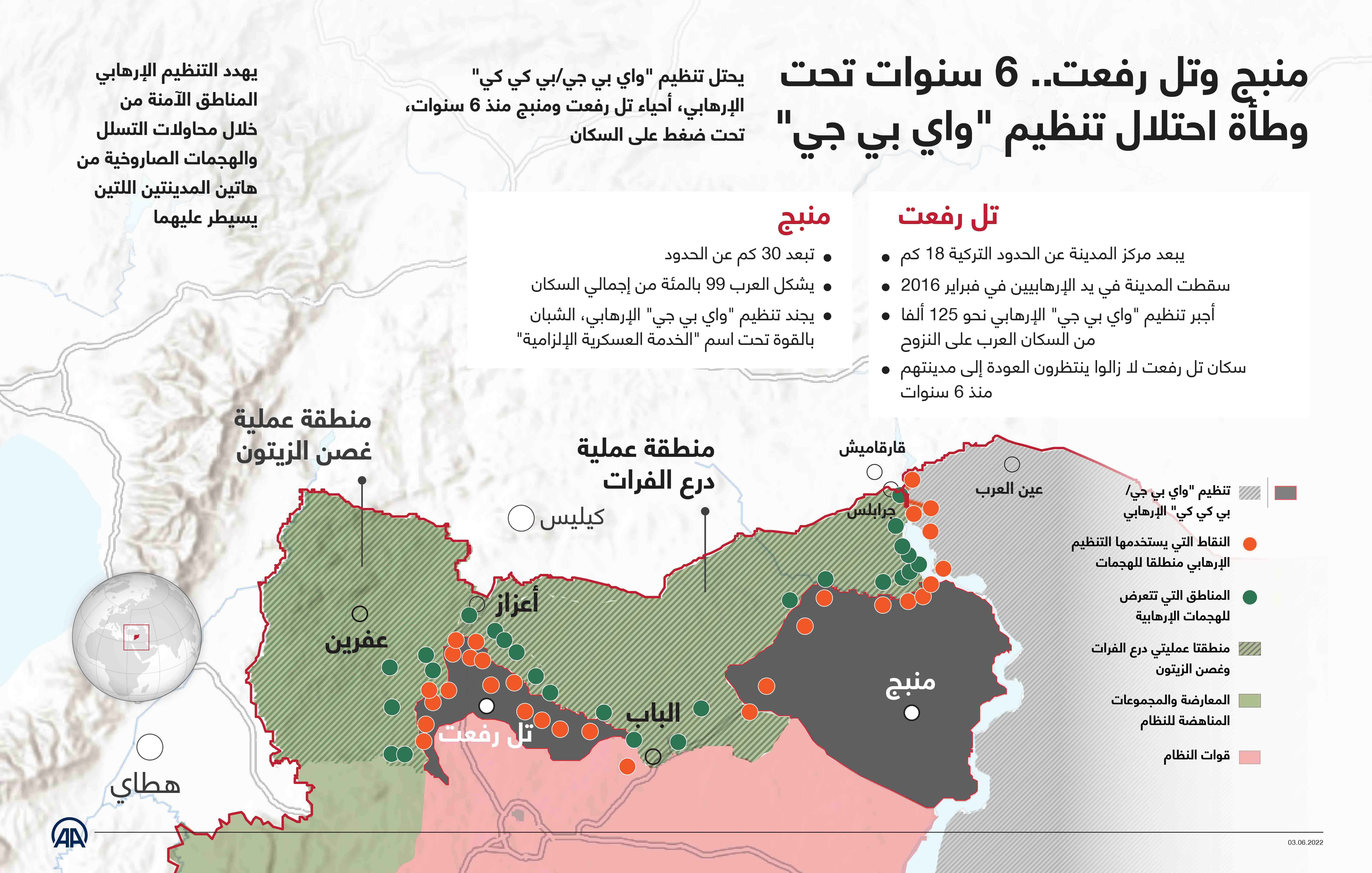 يحتل تنظيم "واي بي جي/بي كي كي"الإرهابي، أحياء تل رفعت ومنبج منذ 6 سنوات، تحت ضغط على السكان. وفق وكالة الأناضول.