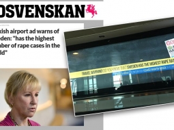عرض شريط إخباري في مطار أتاتورك الدولي بإسطنبول رسالة يوم الجمعة تقول: "تحذير للمسافرين! هل تعلم أن السويد فيها أكبر معدلات للاغتصاب في العالم؟".