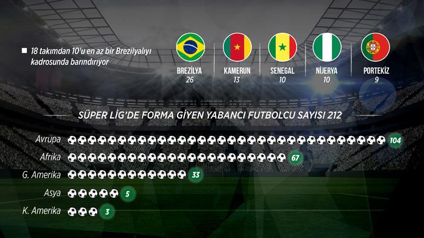 تصدّر اللاعبون البرازيليون قائمة الأجانب الناشطين في النسخة الحالية للدوري التركي الممتاز لكرة القدم حيث يتوزع 26 لاعبا من راقصي السامبا على 10 أندية يخوضون غمار "السوبرليغ" بفارق كبير عن بقية الجنسيات.