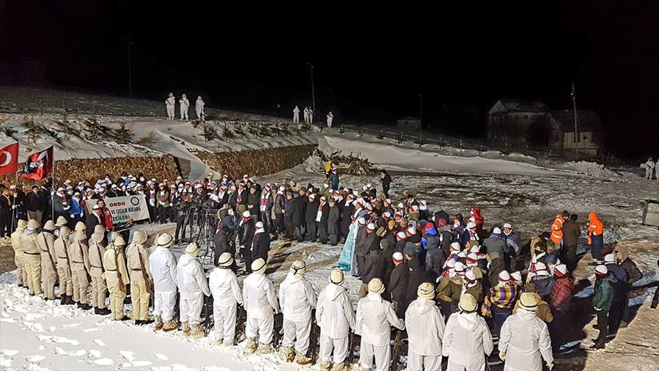 رابط مئات المواطنين الأتراك مع الجنود في العراء في العاصفة الثلجية بولاية "أرودو"شمال تركيا، لإحياء ذكرى شهداء صاري قامش، التي استشهد فيها 30 ألف جندي عثماني تركيا أثناء الحرب العالمية الثانية.