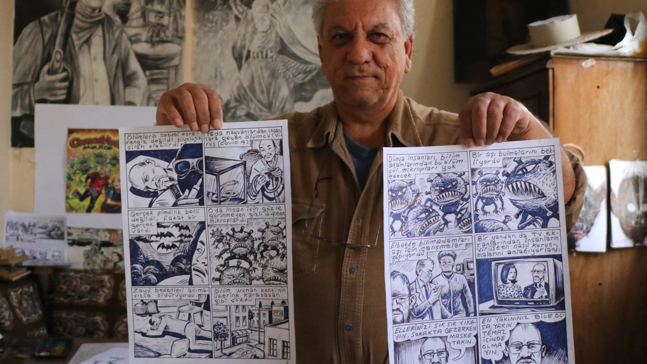 يعمل رسام الكاريكاتير التركي أربيل إشين البالغ من العمر 60 عاما ويقيم في ولاية أضنة، على تحويل وباء فيروس كورونا الذي أثر على العالم بأسره إلى رواية مصورة، بمهارته الشهيرة في الرسم التي استخدمها في السابق لتأليف رواية كاريكاتيرية عن محاولة انقلاب 15 تموز.