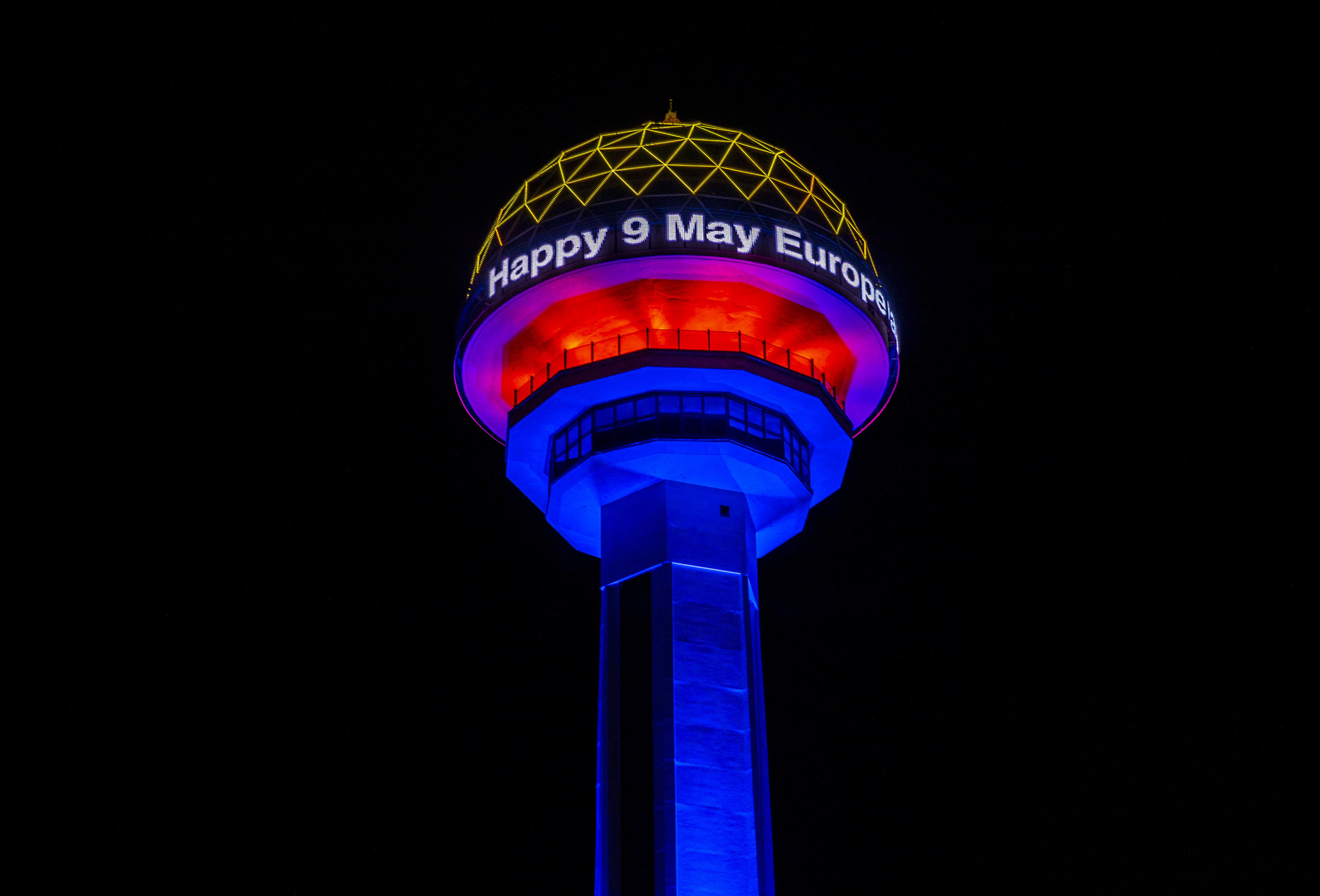 بمناسبة "يوم أوروبا" الذي يوافق 9 مايو/أيار من كل عام، أضيء برج "أتاكوله" أحد أهم معالم العاصمة التركية أنقرة بألوان علمي تركيا والاتحاد الأوروبي.