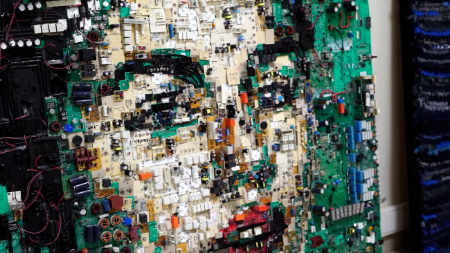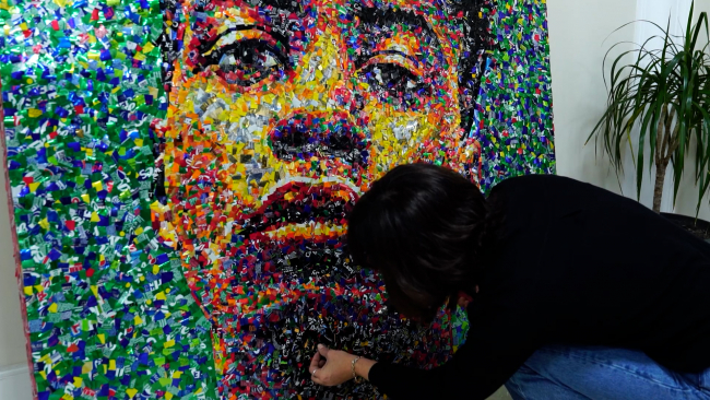 اقترب المراسل من إحدى اللوحات ولاحظ بأن قِطعَها مكونة من قماش الجينز، ولم يتم تلوينها بالألوان بل صُنعت بالكامل من قطع الجينز البالية. وفي لوحة أخرى مختلفة تمامًا، اعتمد الفنان على تثبيت لوحات دوائر النفايات الكهربائية على القماش بالبراغي، لتظهر لوحة فنية رائعة الجمال.
